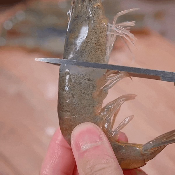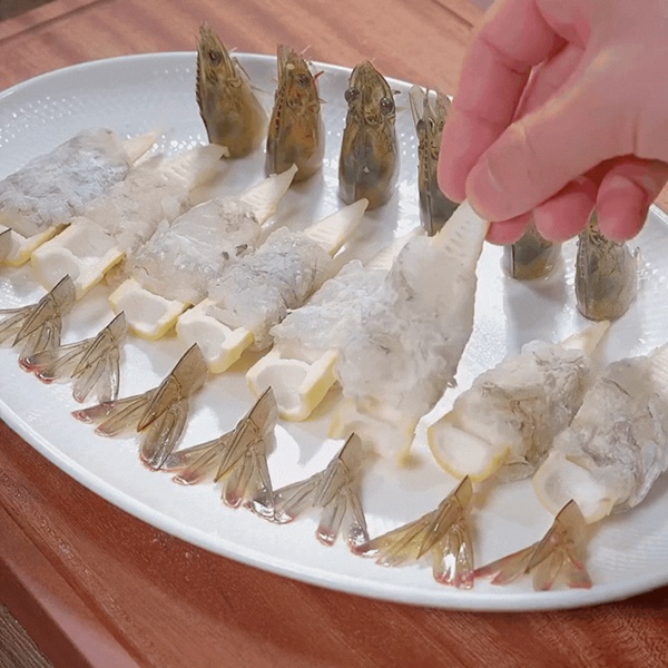 Bước 1: Bắt đầu bằng việc thao tác khéo léo với đôi kéo, bạn cần cắt đi phần đầu và đuôi của tôm. Lưu ý, hãy cẩn thận để không cắt quá sâu vào phần thịt tôm ngon lành - những phần này sẽ được dùng để tô điểm cho món ăn, tạo hình thức bắt mắt hơn. Tiếp tục bóc vỏ tôm, sau đó dùng lưỡi dao khía nhẹ dọc lưng tôm để loại bỏ sợi chỉ đen. Những con tôm khác cũng được làm sạch theo cách tương tự, đảm bảo tất cả sẵn sàng cho các bước tiếp theo.