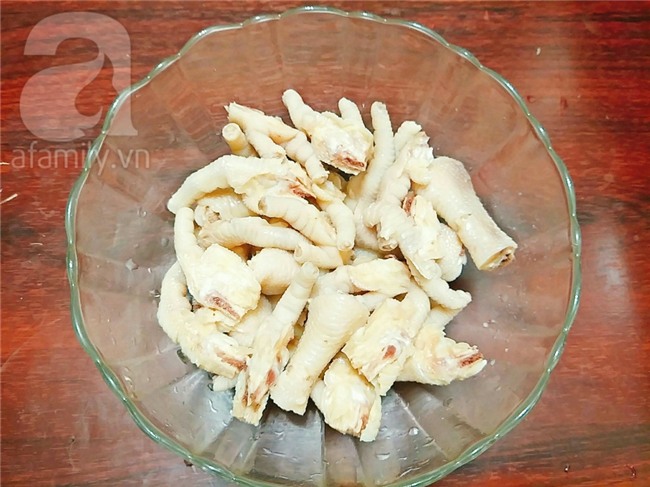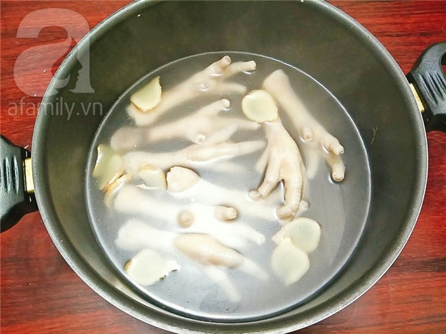 Chân gà rửa sạch với chút dấm và muối rồi cắt bỏ móng chân gà. Đun 1 nồi nước sôi sau đó cho 1 chút muối và dấm, gừng thái lát rồi cho chân gà vào luộc tới khi chân gà vừa chín tới là vớt ra ngay.