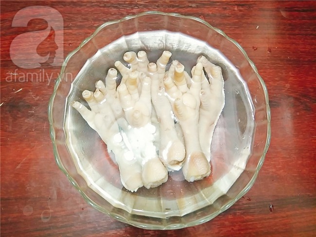 Ngâm chân gà vào tô nước đá lạnh 10 phút cho chân gà được giòn.