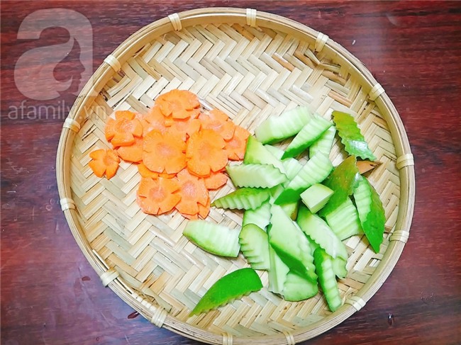 Xoài xanh rửa sạch sẽ sau đó xắt miếng vừa ăn, để nguyên phần vỏ xoài để xoài giữ được độ giòn nhé, cà rốt nạo vỏ và tỉa hoa rồi thái lát vừa mỏng.
