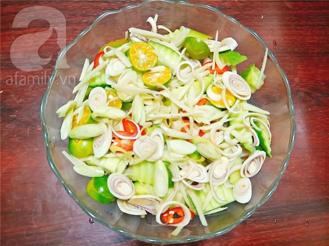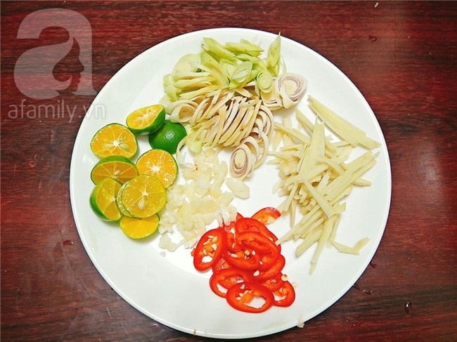 Quất thái làm 3 miếng, tỏi băm nhỏ, ớt sừng thái lát mỏng hoặc băm nhỏ đều được, sả thái lát mỏng, gừng thái sợi.