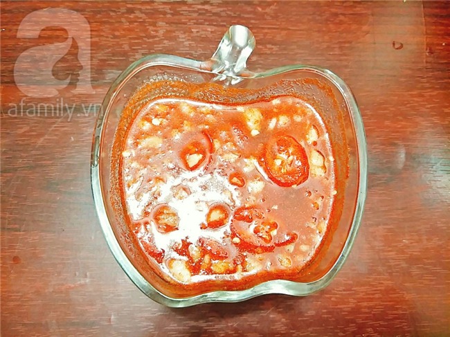 Cho các gia vị nước mắm, đường, dấm vào 1 cái bát rồi khuấy đều cho tan đường sau đó cho tỏi băm, ớt, ớt bột trộn đều nguyên liệu.