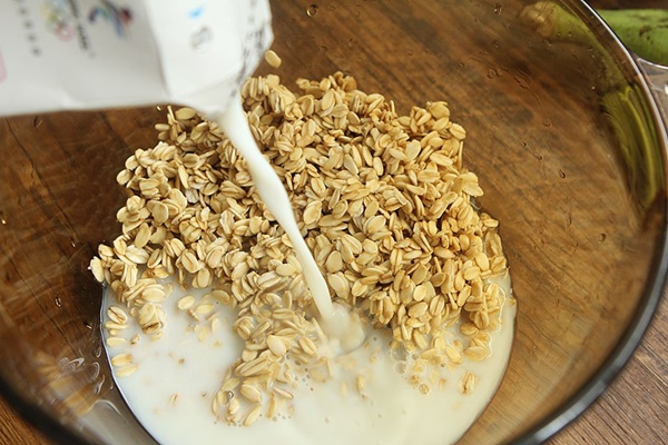 Cho yến mạch ngâm mềm vào nồi, thêm sữa tươi.