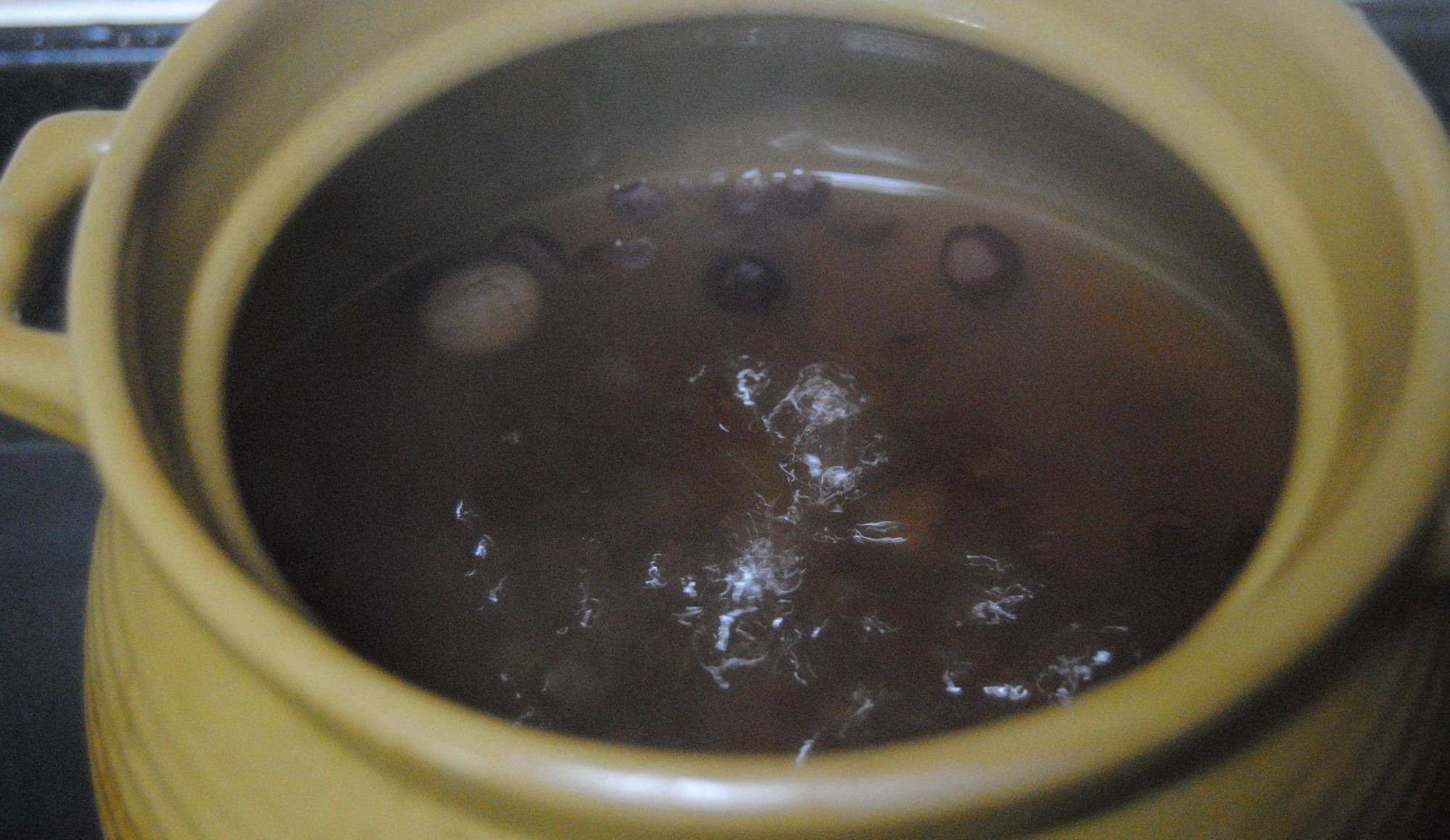 Cho long nhãn và nhựa đào vào nồi chuyên dụng như nồi sứ, nồi đất. Thêm nước gấp 3 lần. Đun sôi sau đó hạ nhỏ lửa, nấu trong khoảng 20 phút. Sau đó cho thêm đường phèn vào đun thêm 5 phút nữa.