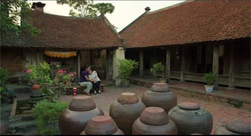 Ngôi nhà mà bố mẹ Linh đang ở trong phim Tuổi thanh xuân 2 là một trong số ngôi nhà cổ đẹp và lâu nhất ở đây được xếp hạng nhà cổ dân sinh loại 1. Ngôi nhà gây ấn tượng mạnh cho khách tới thăm bởi màu xanh cây cối, các vại tương màu nâu trầm xếp hàng đều tăm tắp trên khoảng sân gạch. Ảnh cắt từ clip.