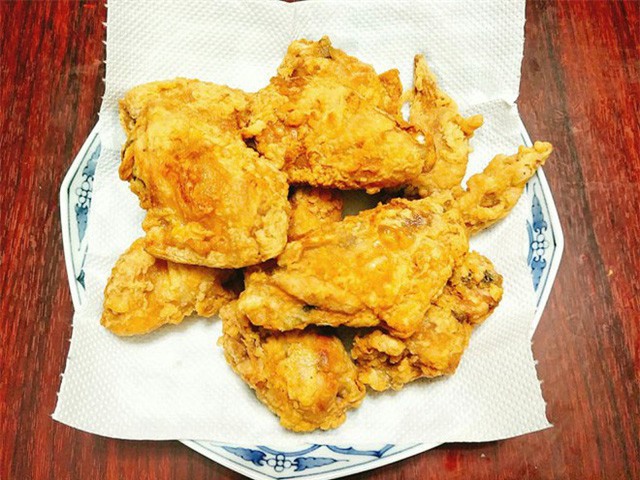 - Bước 5: Đặt chảo lên bếp và cho nhiều dầu sau đó đun cho dầu đủ nóng thì gắp cánh gà cho vào chảo dầu chiên, lật cánh gà và chiên tới khi cánh gà chuyển màu vàng giòn thì vớt ra để ráo dầu.