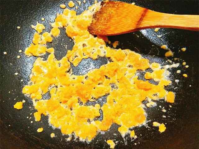 - Bước 6: Đổ hết dầu ăn trong chảo ra, cho bơ vào đun cho bơ tan chảy sau đó cho tỏi băm vào phi cho thơm, tiếp theo, cho trứng muối vào xào cho dậy mùi thơm mới cho thêm 3 thìa sữa tươi hoặc nước vào cùng, đun cho hỗn hợp sôi lên.