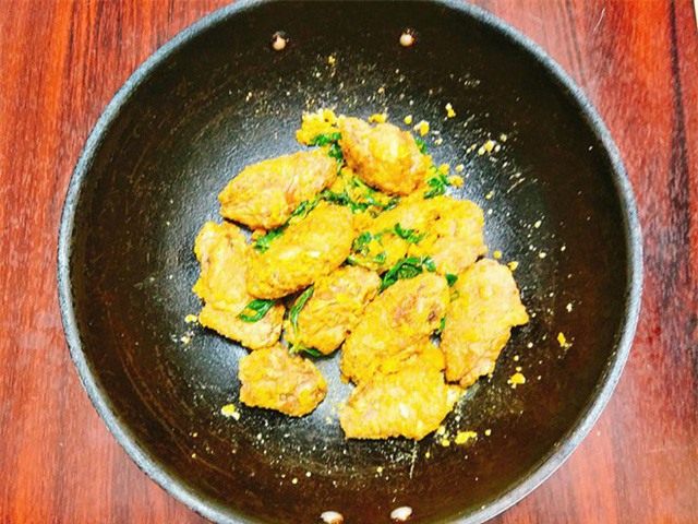 - Bước 7: Cuối cùng, cho chút đường, bột cà ri, lá húng quế và đảo đều sau đó trút tất cả cánh gà vừa chiên giòn vào cùng. Cầm chảo xóc thật đều cho trứng muối bám đều vào cánh gà là tắt bếp.