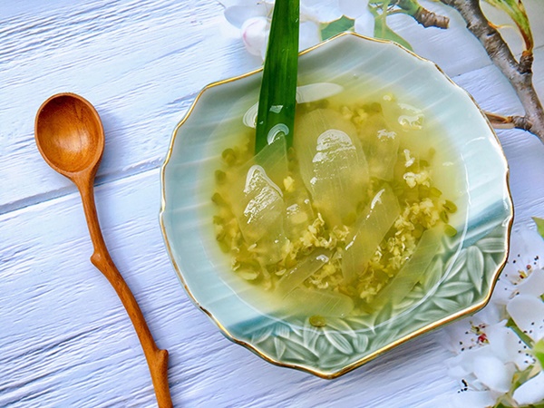 - Chè đậu xanh nha đam là món ăn ngon, thơm ngọt, có chút vị bùi bùi từ đậu, giòn tan của nha đam được nhiều chị em yêu thích.