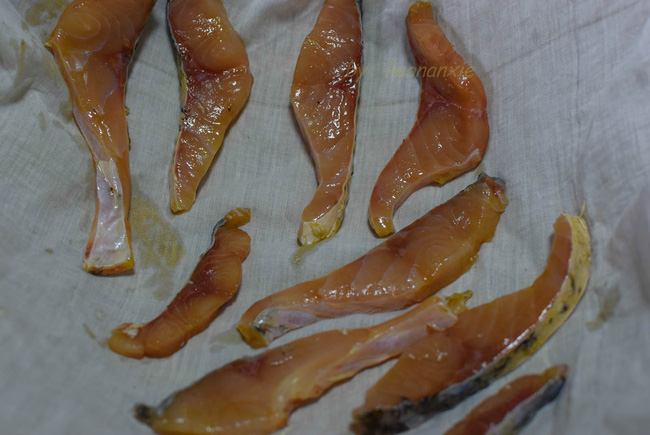 Cá sau khi ướp xong bạn đặt từng miếng lên khăn giấy để thấm bớt nước thừa. Đây là cách giúp cá chiên không bị bắn đấy.