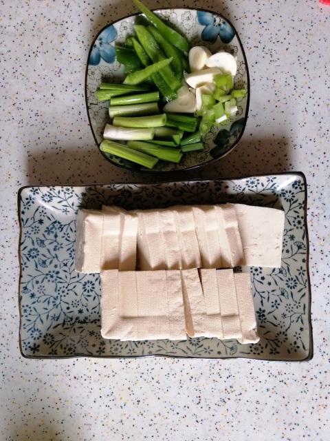 Chị em rửa sạch đậu hũ với nước rồi lấy giấy ăn thấm hết nước trên các mặt đậu. Cắt đậu thành những miếng vuông nhỏ, mỗi miếng dày khoảng 2cm. Hành lá bỏ gốc, rửa sạch và cắt khúc dài. Tỏi bóc vỏ, cắt lát.
