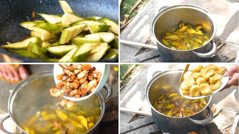 - Xào chuối trong 5 phút rồi bạn đổ tô thịt ba chỉ cùng đậu hủ chiên vào rồi trộn đều.