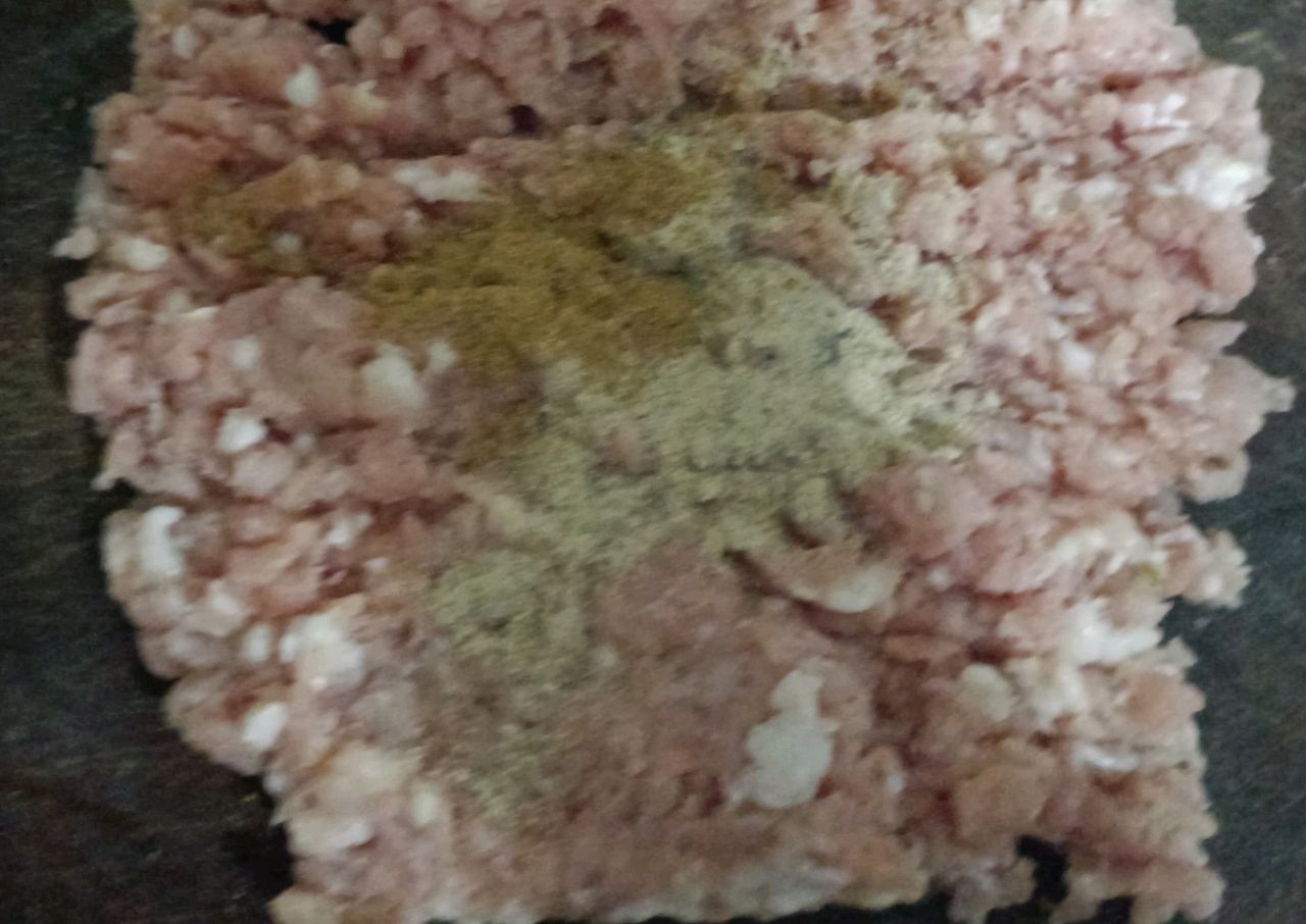 Bước 2: Thịt lợn rửa sạch rồi băm nhỏ. Thêm vào một ít tiêu, một ít bột ngũ vị hương và một ít nước tương, dầu ăn. Trộn thật kỹ để các nguyên liệu đồng nhất. Đun nóng nồi, cho dầu ăn rồi thêm thịt vào xào đến khi chín thì cho nấm hương, cồi sò điệp và hành lá cắt nhỏ vào đảo đều.