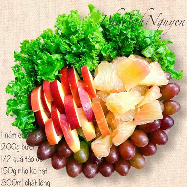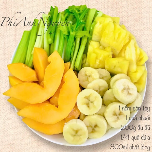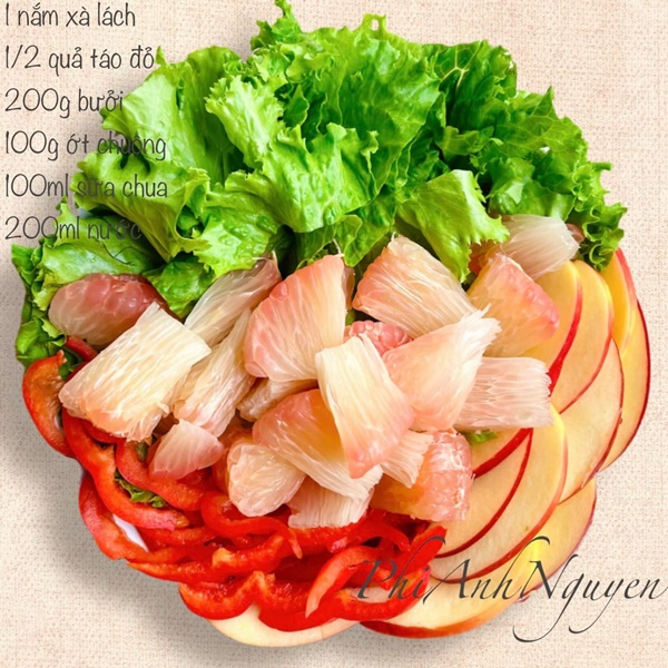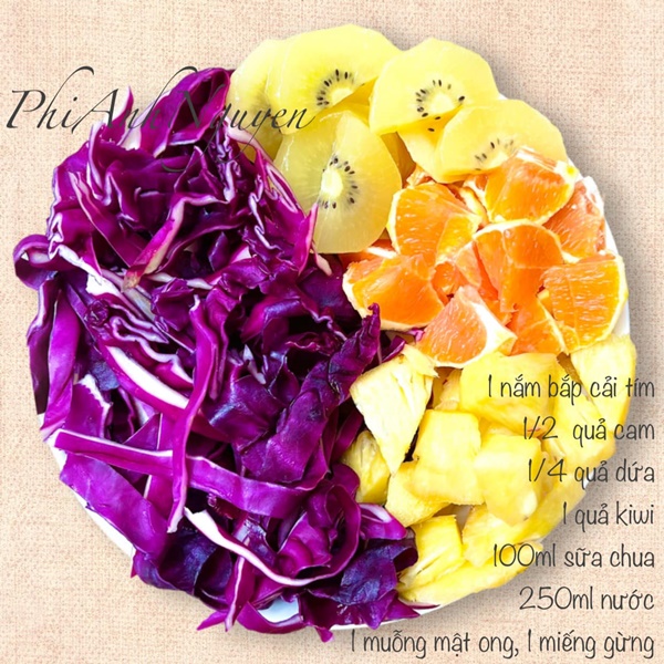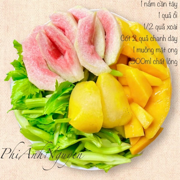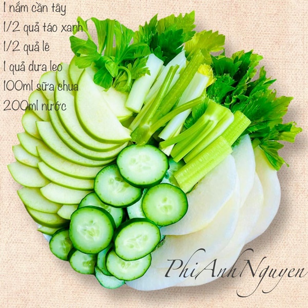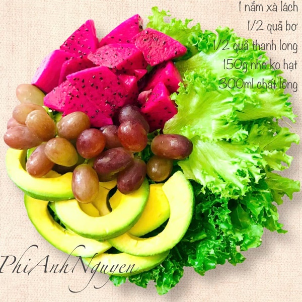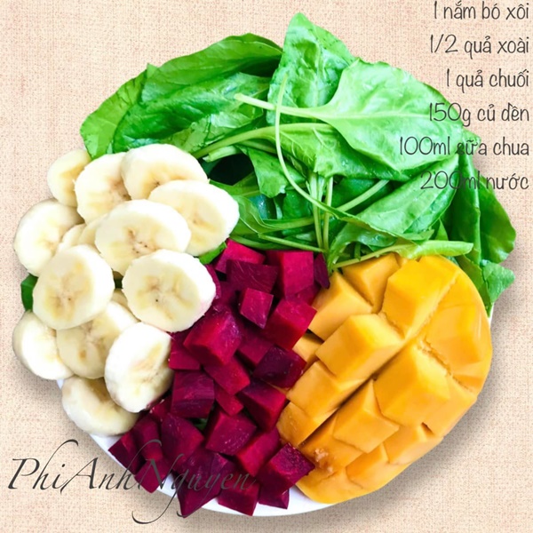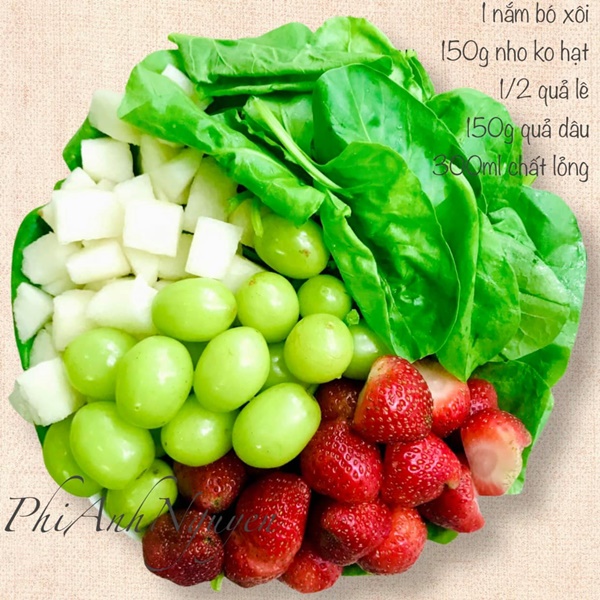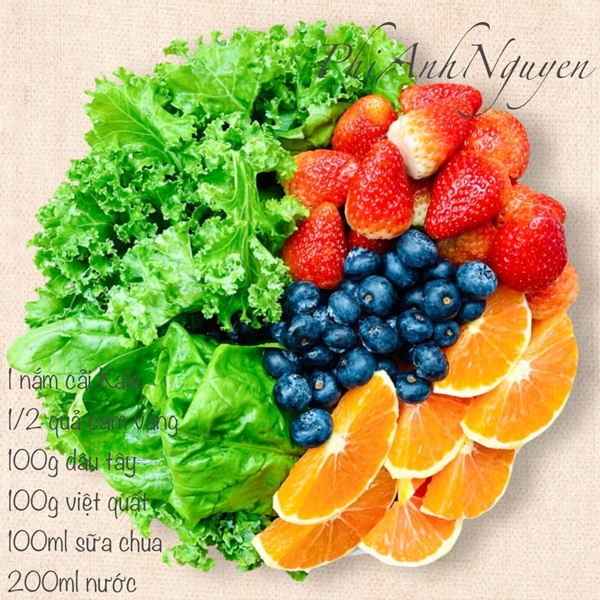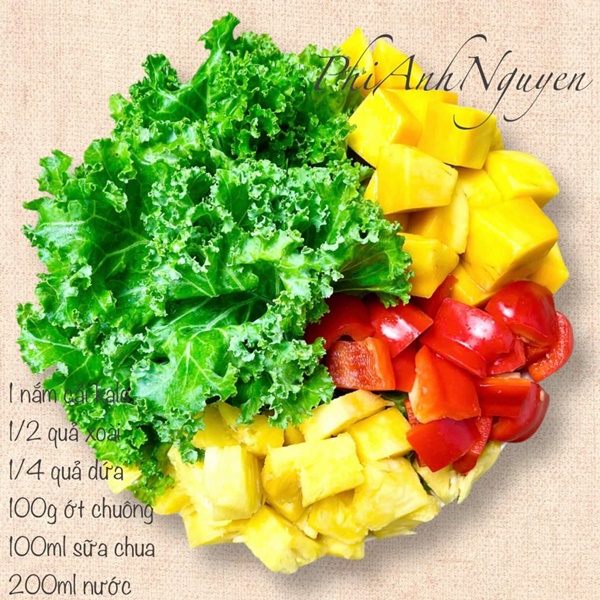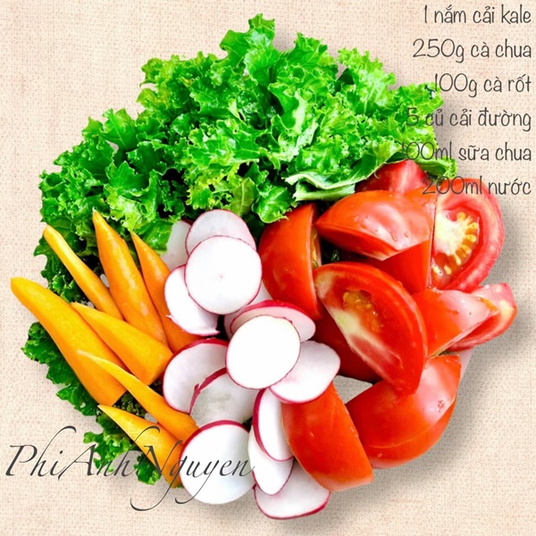 Phi Anh thường kết hợp rau củ quả theo sở thích. Cố gắng đa dạng theo màu sắc và trải đều các loại rau củ quả trong tuần. Đặc biệt cô luôn theo nguyên tắc 1 ly bao gồm:
