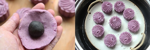 Phần mứt đậu đỏ viên thành từng viên tròn nhỏ. Ngắt lượng bột khoai lang thích hợp, ấn dẹt rồi cho phần nhân mứt đậu đỏ vào bọc kín. Cho viên bánh vào khuôn nhấn để tạo hình. Xếp bánh vào đĩa rồi cho vào nồi hấp, hấp khoảng 25 phút là bánh chín.