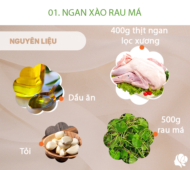 Chuẩn bị: 400g thịt ngan lọc xương, 500g rau má, dầu ăn, hành khô, tỏi khô, muối.