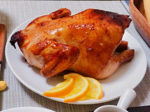 Gà nướng cam cũng là món ăn chống ngấy dễ làm tại nhà. Bạn rắc muối đều con gà, sau đó rửa sạch, trộn các gia vị tẩm ướp rồi xoa lên khắp mặt gà trong và ngoài, ướp 1 tiếng. Tiếp đến, bạn đút vỏ cam và các lá gia vị khô vào bụng gà, nếu không có phần lá thơm khô thì chỉ cần đút vỏ cam, dùng tăm hoặc ghim nướng ghim bụng gà lại. Bạn tiếp tục đặt gà vào nồi chiên không dầu hoặc lò nướng. Bạn chỉnh 200 độ C khi dùng nồi chiên không dầu, lò nướng chỉnh 240 độ C. Nướng 10 phút thì hạ xuống 180 độ C đối với nồi chiên, 200 độ C với lò nướng.