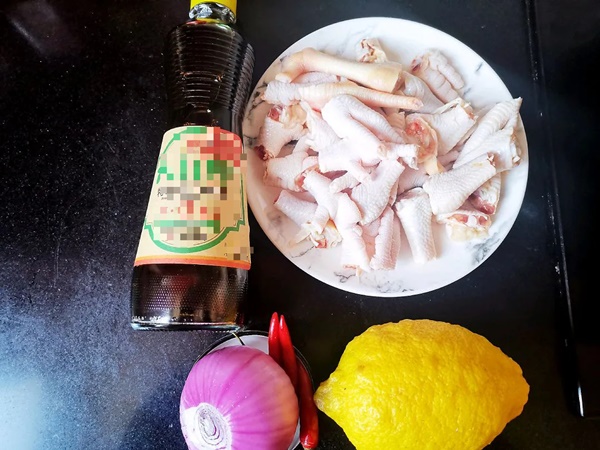 500g chân gà, 1 quả chanh vàng, một ít rau mùi, 5 thìa nước tương, 1/2 củ hành tây, 2 thìa đường, 1 nhánh gừng, 7 thìa giấm đen (giấm balsamic), 1 hoặc 2 quả ớt, 2 cây hành lá, 1 thìa muối, 1 thìa tinh chất gà, 1 thìa rượu nấu ăn, 5 tép tỏi.