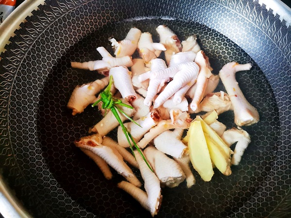 Bước 1: Chân gà bạn mua về rửa sạch với muối và giấm. Cắt bỏ móng chân gà rồi chặt thành từng miếng. Nếu nhà có trẻ em thì bạn hãy mua chân gà rút xương nhé! Đổ nước lạnh vào nồi và thêm chân gà cùng 1 thìa rượu nấu ăn vào. Tiếp theo cho gừng thái lát và hành lá vào, đun sôi ở lửa lớn rồi giảm lửa nhỏ đun liu riu trong 10 phút. Bạn có thể nấu đến khi mềm tùy theo sở thích cá nhân. Sau đó vớt chân gà ra cho vào tô nước lạnh.