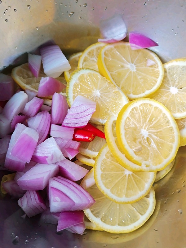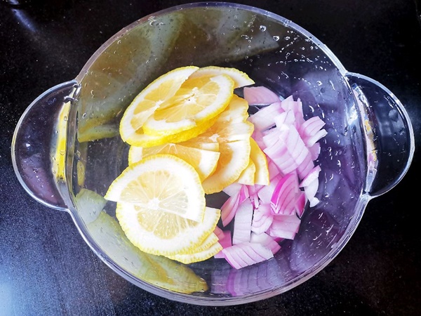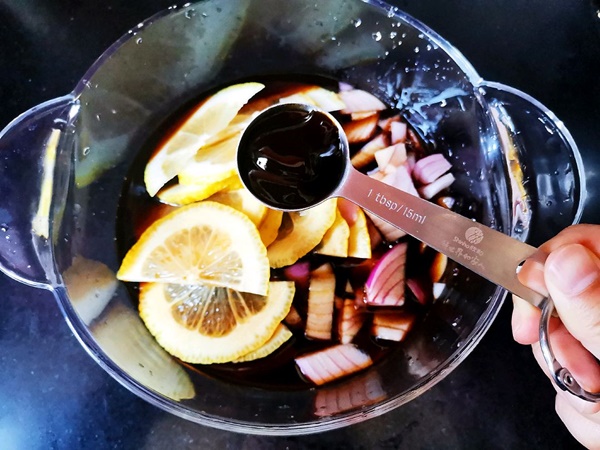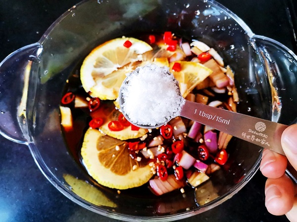 Bước 2: Chanh bạn đem cắt dọc làm đôi sau đó thái lát mỏng. Hành tây cắt miếng nhỏ. Cho hành và chanh vào âu rồi thêm 5 thìa nước tương và 7 thìa giấm đen. Sau đó bạn cho thêm 1 thìa tinh chất gà, 2 thìa đường, cùng ớt xắt nhuyễn và tỏi băm vào, trộn đều tất cả các nguyên liệu.