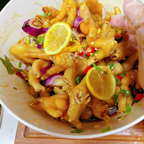 Bước 3: Sau đó bạn cho chân gà vào, trộn đều và để ngấm trong khoảng 2 giờ. Sau đó bạn cho chân gà trộn chua cay ra đĩa, thêm rau mùi lên trên là có thể thưởng thức.