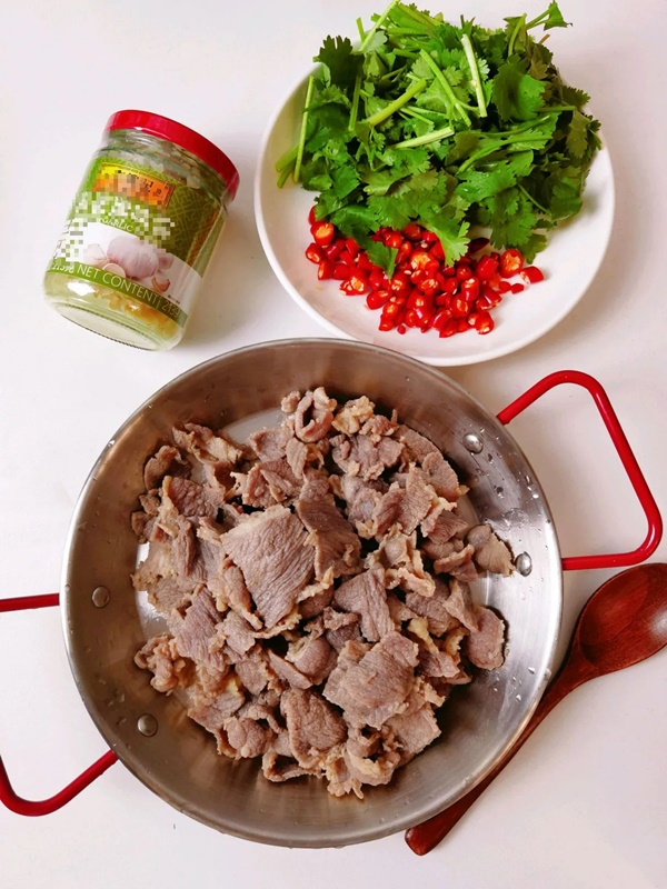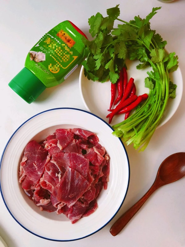 Bước 1: Thịt bò đem ngâm trong nước cho ra hết huyết thừa và tạp chất rồi lấy ra thấm khô nước. Thái thịt bò thành các miếng mỏng. Cắt nhỏ rau mùi và gừng đem thái lát mỏng rồi đặt sang một bên. Thêm xì dầu, rượu nấu ăn và ướp khoảng 15 phút.