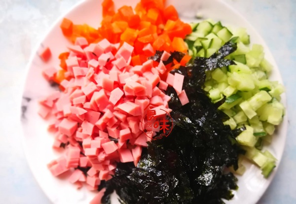 - Cắt nhỏ giăm bông, dưa chuột và cà rốt, cho vào nồi hấp chín rồi gấp rong biển thành từng miếng nhỏ để dùng sau.