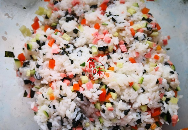 - Sau khi cơm với giấm sushi nguội hoàn toàn, cho giăm bông, cà rốt, dưa chuột và rong biển vừa cắt vào, đảo đều.