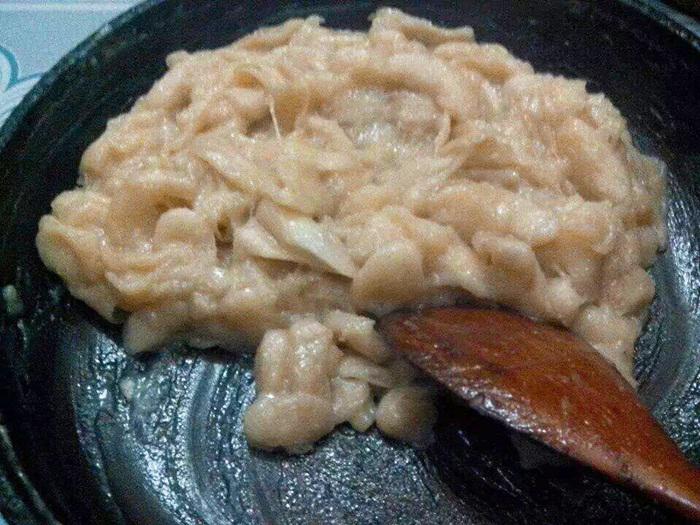 Bước 4: Đợi tới khi nước hơi cạn thì dùng muôi gỗ vét đáy chảo để mãng cầu được nhuyễn và không bị khê, dính vào đáy chảo. Đảo đến khi mãng cầu chuyển sang sền sệt đặc sánh lại thì rắc vani vào, vẫn đảo đều, nhắc xuống khỏi bếp.
