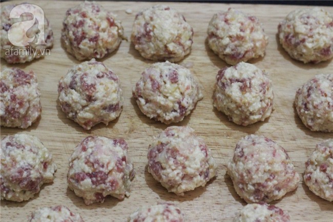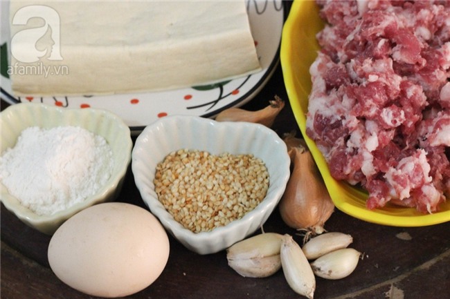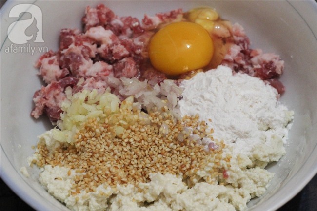 Trộn đều thịt heo xay, đậu phụ, vừng, bột bắp, trứng, hành tỏi băm và chút hạt nêm.