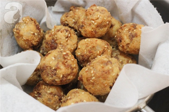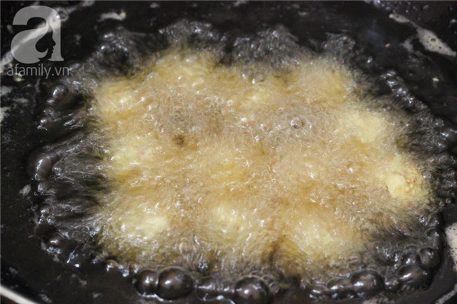Khi viên đậu vàng đều, bạn vớt ra giấy thấm dầu cho ráo.