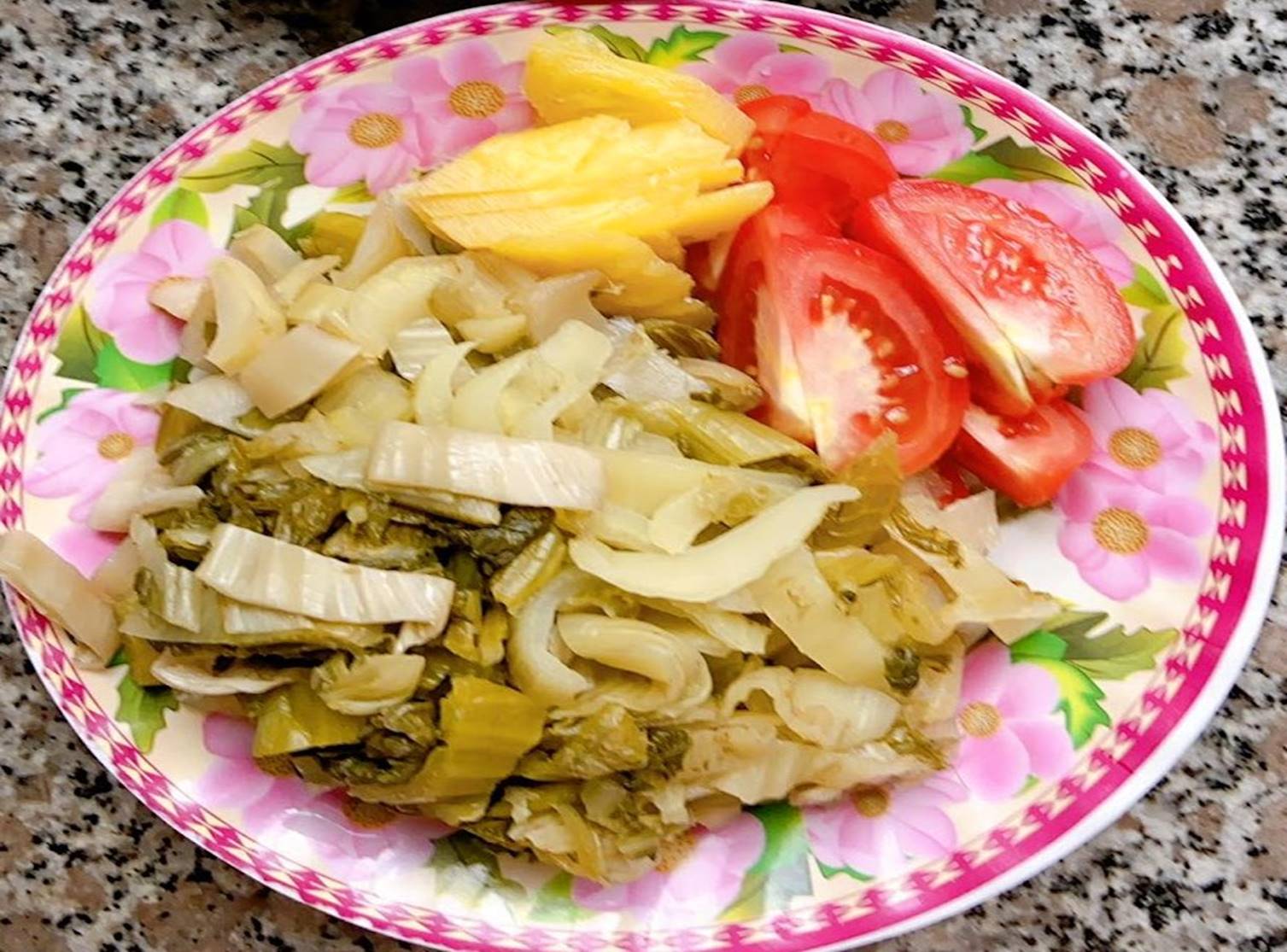 - Dưa chua đem đi rửa sạch, bóp cho bớt nước rồi để ráo, nếu như dưa chua của bạn mua chưa cắt ra thì bạn nên cắt thành từng miếng nhỏ.
