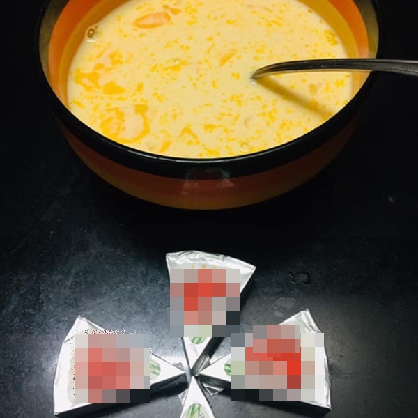 Bạn cho vào bát 3 lòng đỏ trứng gà, 4 muỗng canh sữa đặc, 200ml sữa tươi không đường và 4 miếng phô mai con bò cười. Sau đó, dùng muỗng hoặc phới lồng đánh đều tay để các nguyên liệu quện vào nhau.