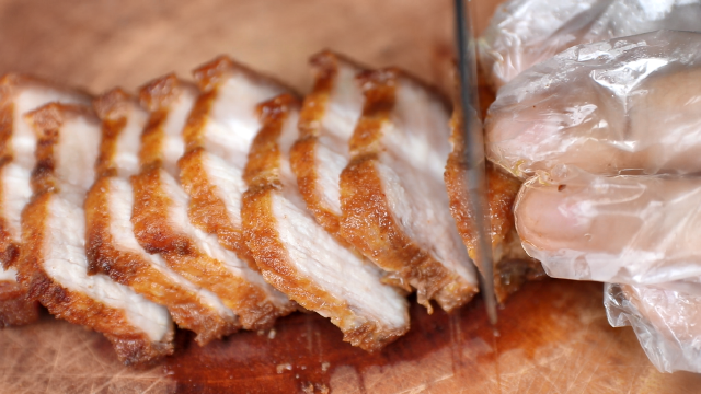 Chiên xong, bạn thái thịt ba chỉ thành miếng nhỏ.