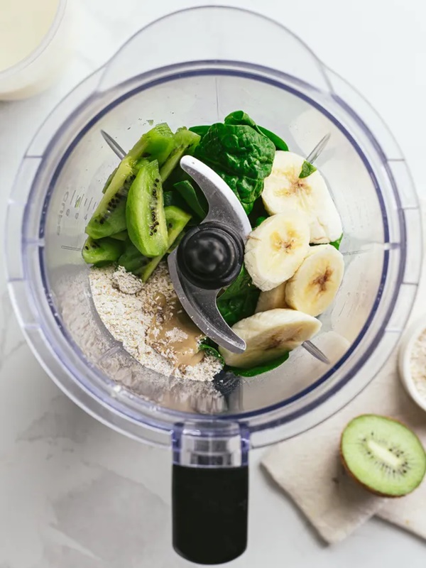 Bước 1: Cho yến mạch vào máy xay, xay đến khi chúng thành bột mịn. Rau chân vịt chọn lấy phần lá, bỏ phần cuống cứng. Kiwi gọt vỏ, chuối cũng bỏ vỏ, cắt nhỏ cho vào máy xay. Thêm sốt bơ vừng và sữa đậu nành.