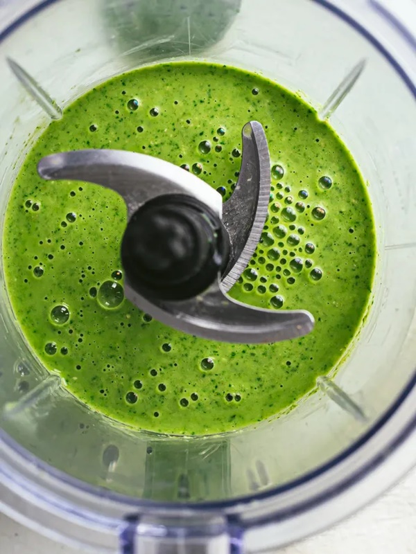 Bước 2: Xay hỗn hợp thành sinh tố mịn đều màu xanh. Nếm thử vị ngọt của sinh tố và cho thêm chuối hoặc 1 thìa cà phê mật ong/xi rô cây phong để tăng thêm độ ngọt nếu bạn thích.