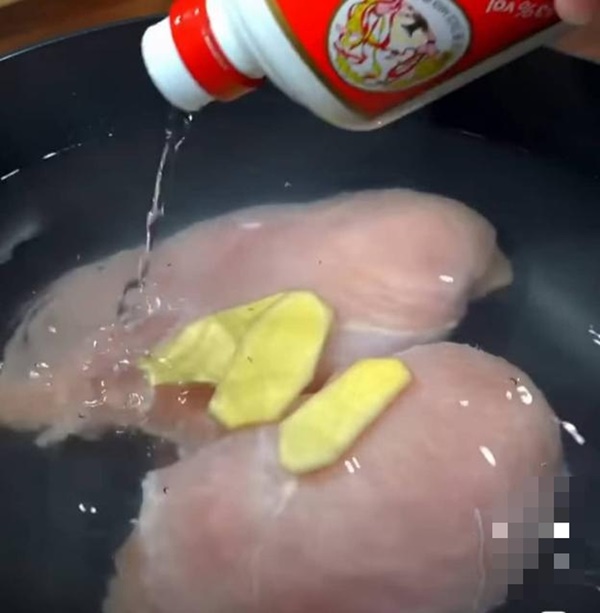 Ức gà bạn sát muối và chanh để khử mùi rồi rửa sạch với nước. Sau đó cho ức gà vào nồi luộc chín tới với 1/2 thìa muối, 1 củ hành khô đập dập và vài lát hành tươi.