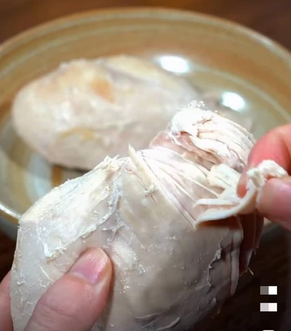 Sau khi ức gà chín tới, bạn vớt ra để thật nguội rồi bắt đầu xé sợi ức gà theo chiều dọc thớ như hình hướng dẫn.