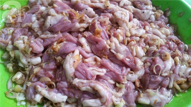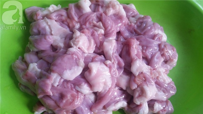 Lòng mua về làm sạch, bóp thêm muối và chanh để khử mùi. Cắt lòng thành các miếng dài bằng nhau.