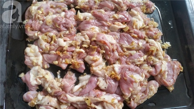 Sả, gừng đập dập, băm nhỏ cho vào ướp cùng lòng, thêm 2 thìa sa tế nhỏ, 1 thìa đường, 1/2 thìa bột ngọt, 1 thìa nước mắm rồi đi bao tay bóp đều cho lòng ngấm gia vị. Dùng màng bọc thực phẩm bọc lại rồi cho làng vào ngăn mát tủ lạnh khoảng 2 giờ đồng hồ, sau đó mới mang ra nướng.