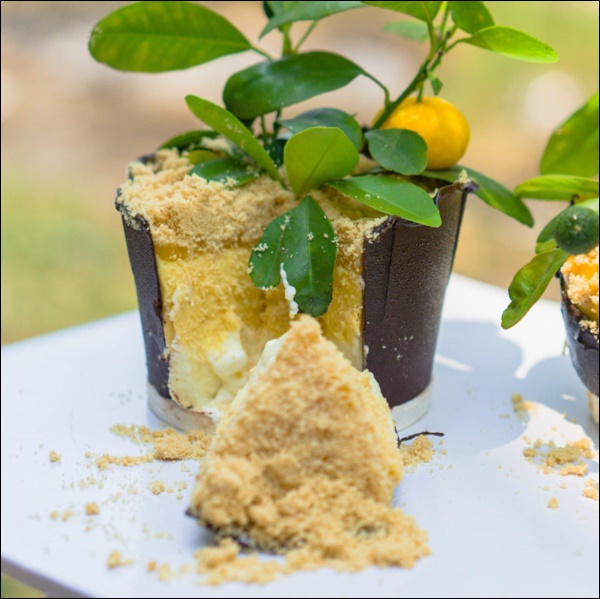 - Phủ 1 lớp bánh quy bơ xay vụn, hoặc bánh Oreo, như màu đất. Sau đó, chọn loại cây yêu thích, rồi tạo hình cho chúng.