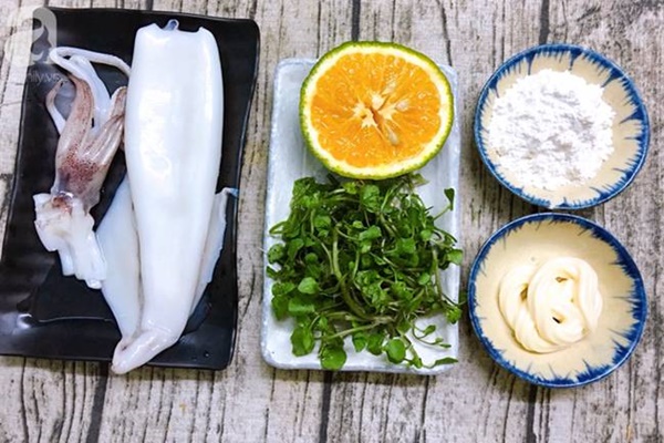 Đun nóng dầu, lần lượt nhúng mực và cải xoong vào hỗn hợp bột rồi cho vào chảo chiên chín vàng, vớt ra để ráo dầu.