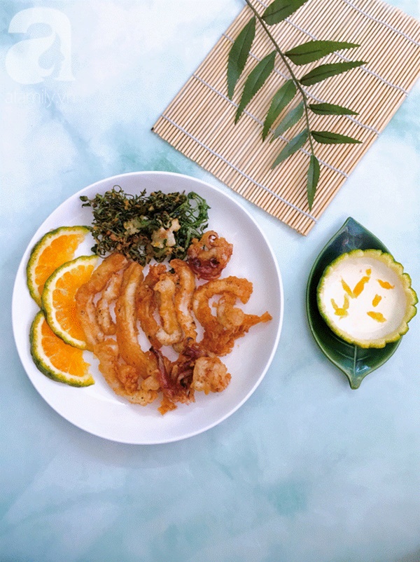 Mực chiên sốt cam giòn tan với lớp vỏ bên ngoài, dai ngọt bên trong, chấm kèm sốt cam beo béo chua ngọt hài hòa vô cùng hấp dẫn.