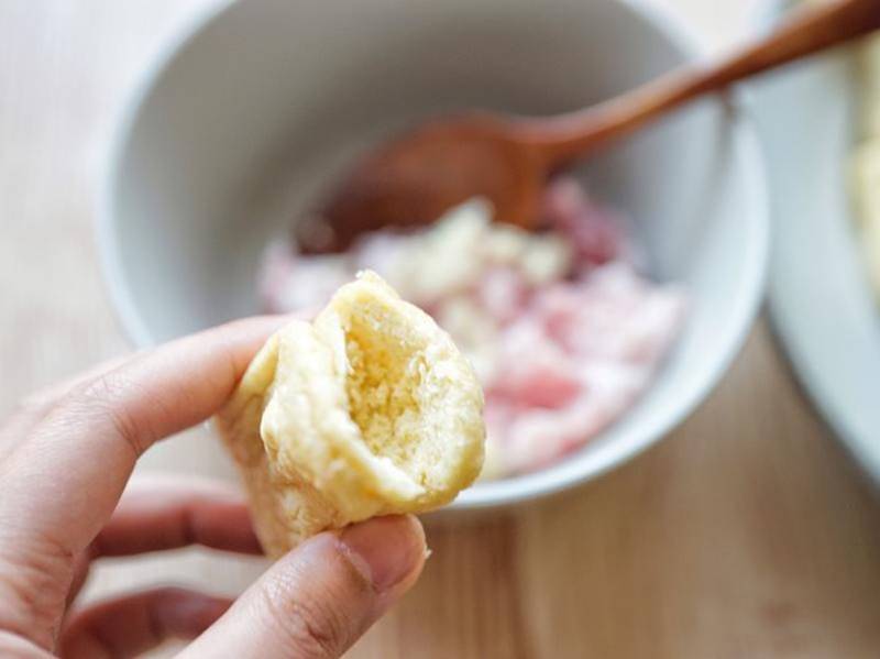 Bước 3: Cho nhân thịt vào túi đậu phụ, đổ đầy 70%, chừa một khoảng trống ở miệng túi và dùng dây măng rối buộc chặt lại. Phần dây buộc túi này bạn có thể dùng sợi củ cải phơi khô ngâm nở hoặc hành xanh đều được.