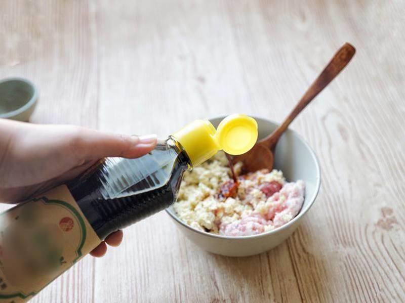 Bước 2: Thêm một thìa cà phê rượu nấu ăn và 1 thìa cà phê nước tương vào thịt băm. Trộn đều để làm nhân nhồi. Phần nhân này bạn có thể thay đổi linh hoạt tùy theo sở thích, chẳng hạn tôm bằm, nấm hương bằm,...