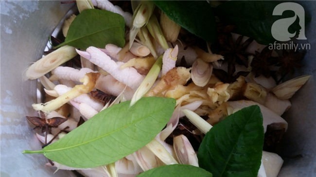 Xếp chân gà vào nồi hấp, lần lượt cho gừng đập dập, sả thái lát, lá chanh, hoa hồi lên trên rồi hấp khoảng 10 phút cho chân gà vừa chín tới (không được hấp kỹ vì sẽ làm da gà co lại).