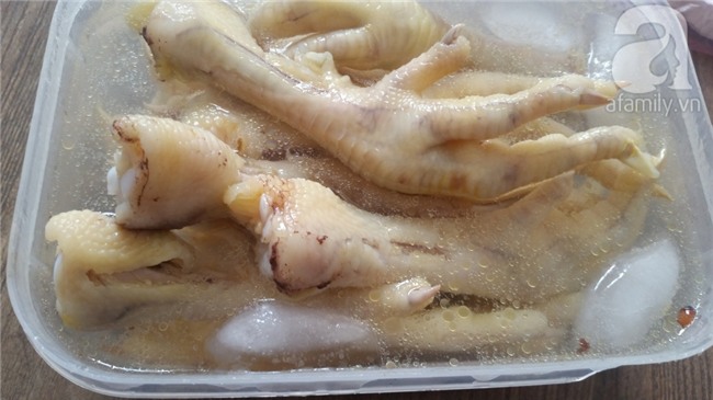 Cho chân gà vừa hấp thả vào âu nước đá để chân gà săn lại, không bị mềm, dính vào nhau, sau đó cho ra để ráo nước.