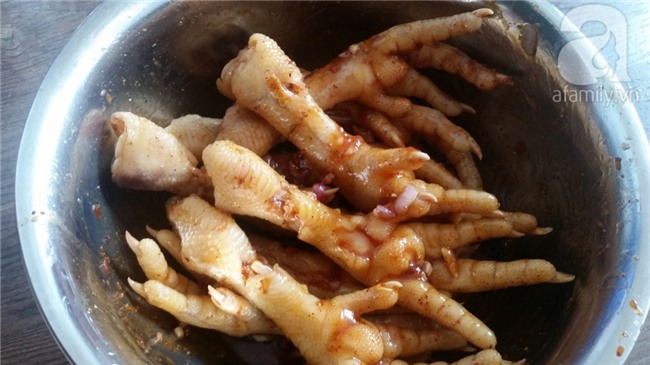 Cho chân gà vào âu to, đi bao tay trộn hỗn hợp trên với chân gà, chà xát để gia vị ngấm đều, sau đó dùng màng bọc thực phẩm bọc kín rồi cất vào ngăn mát tủ lạnh ít nhất 2 tiếng.