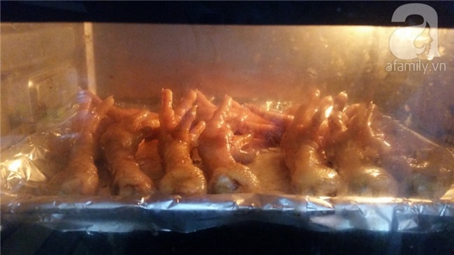 Khi chân gà để tủ lạnh đã đủ thời gian, mang chân gà ra xếp vào khay nước đã lót giấy nến hoặc giấy bạc. Làm nóng lò ở 200 độ, cho chân gà vào nướng đến khi vàng giòn là được. Trong quá trình nướng thỉnh thoảng quét mặt chân gà bằng hỗn hợp mật ong pha cùng chút dầu ăn để da được óng đẹp.