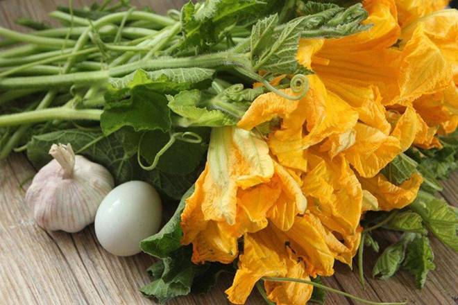 - 1 nắm hoa bí, 1 nắm ngọn rau bí, 5 tép tỏi, 1 quả trứng muối (không có thì bỏ qua), muối vừa đủ, dầu ăn.